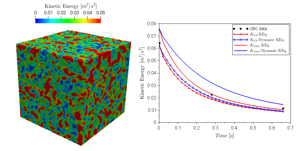 The classical isotropic box turbulence problem is used to examine different LES subgrid-scale models. The plots show the predicted grid resolved kinetic energy (GS) and the total kinetic energy (GS+SGS) and the data by Comte-Bellot and Corrsin (CBC). The results show that the Dynamic K-equation model over predicts the SGS kinetic energy.